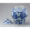 这是有盖,口沿部和足较大,肩部宽阔的器型上用钴蓝颜料绘制了古代传说故事种的人物们的青花白瓷罐。