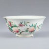 This porcelain bowl from the Qing Dynasty is decorated in the famille rose technique, featuring a meticulously painted peach tree set against a white-glazed ground.