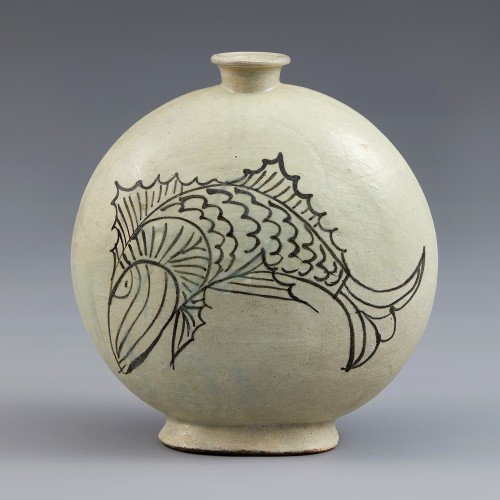 50 분청 보성 덤벙 철화 어문 편병 조선전기 | 21.5×4×10 cm