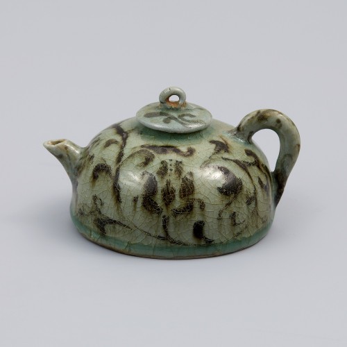 This is a small hemispherical ewer with a lid from the Goryeo period, presumed to have been used as a water dropper. Iron-brown decorated celadon began to be produced at kiln sites such as Jinsan-ri in Haenam and later at Gangjin, mainly in small vessel forms.