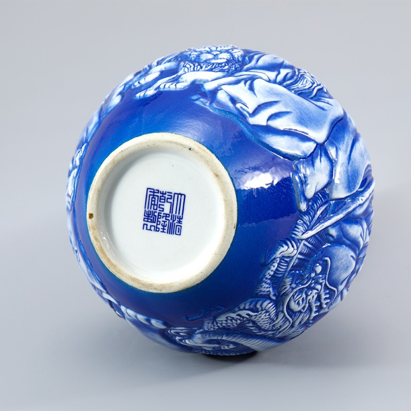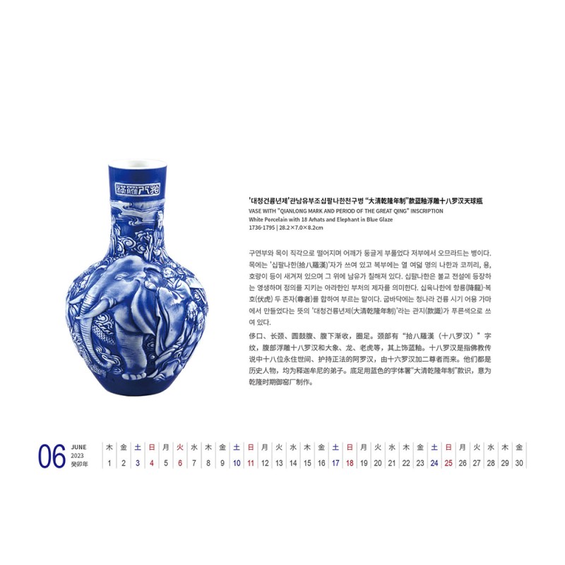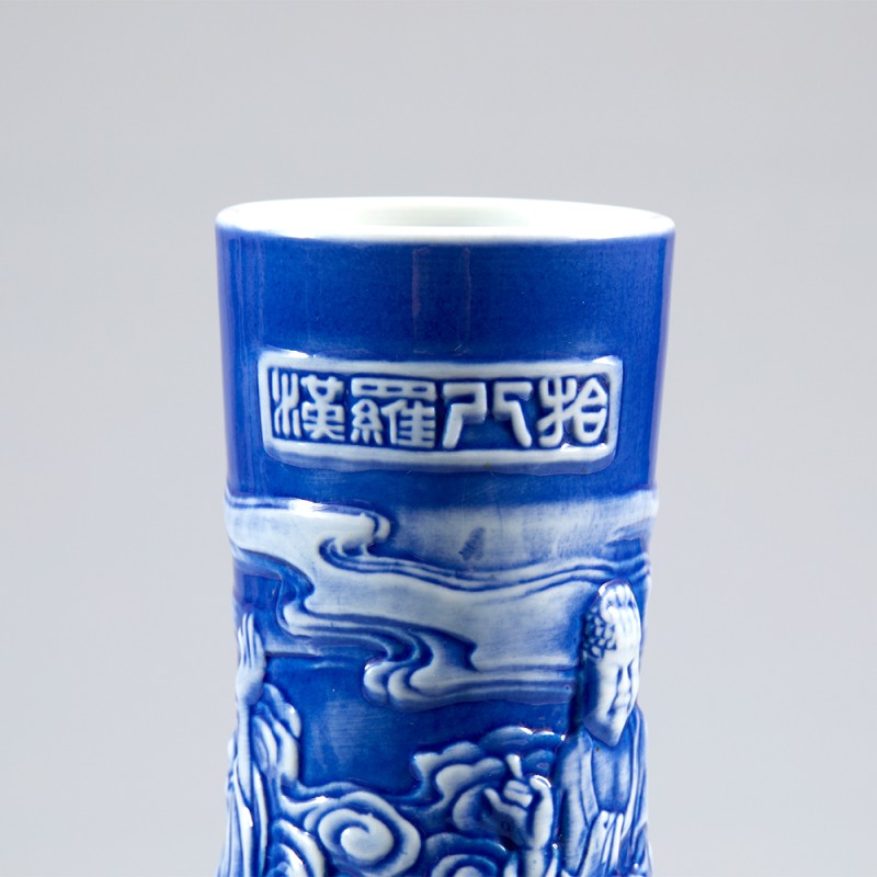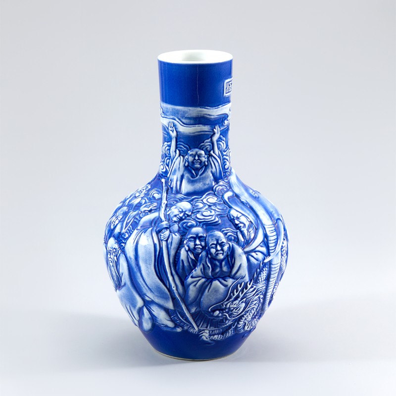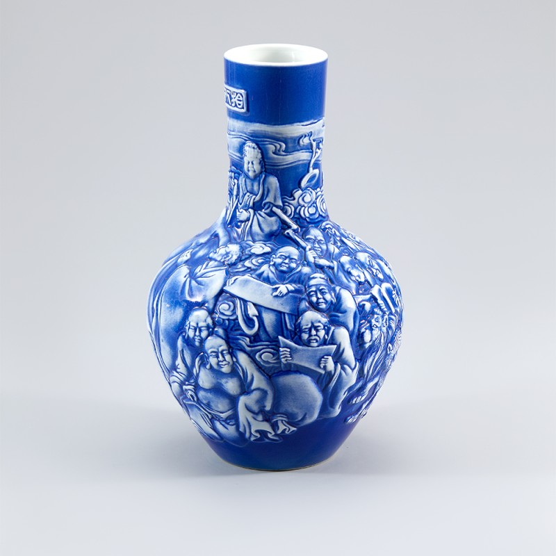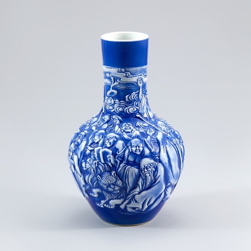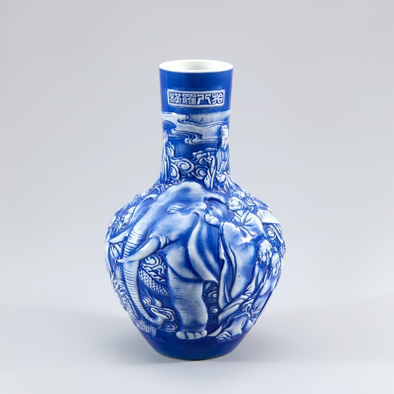 A bottle with a perpendicular mouth, tall neck, and broad shoulders that taper off to the base. On the neck is marked, "Shiba Luohan (十八罗汉)", and on the stomach is decorated with 18 Arhats(luohan), an elephant, dragon, and tiger in ji blue glaze. The 18 Arhats appear in Chinese legends, depicted as the followers of Gautama Buddha who have followed the Noble Eightfold Path and attained the four stages of enlightenment. They are called the 16 Arhats, which derives from the name of the two Buddhist monks or senioritycalled Xiang long (降龍) and Fuhu (伏虎). The bottom of the base is inscribed, "Daqing Qianlong Nian Zhi (大清乾隆年制)" which indicates that it was produced at the imperial kiln during the reign of the Qianlong Emperor of the Qing Dynasty.
