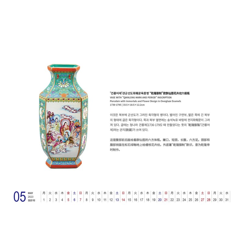 이것은 복부에 군선도가 그려진 육각형의 병이다. 벌어진 구연부, 짧은 목에 긴 복부의 형태에 굽은 육각형이다. 목과 복부 옆면에는 송석녹유 바탕에 전지화훼문이 그려져 있다. 굽에는 청나라 건륭제(1736-1795) 때 만들었다는 뜻의 '乾隆御製'(건륭어제)라는 관지(款識)가 쓰여 있다.