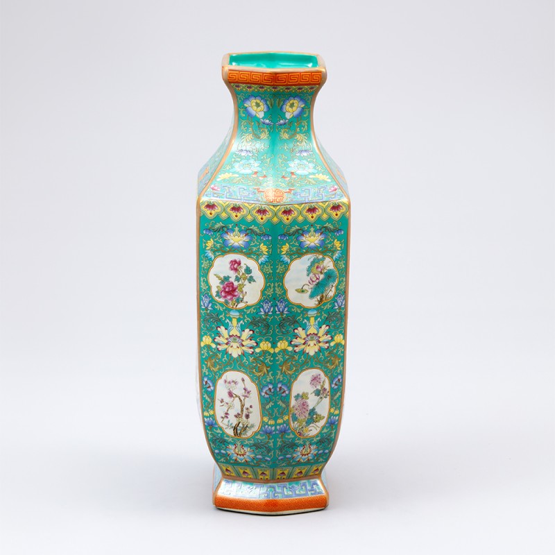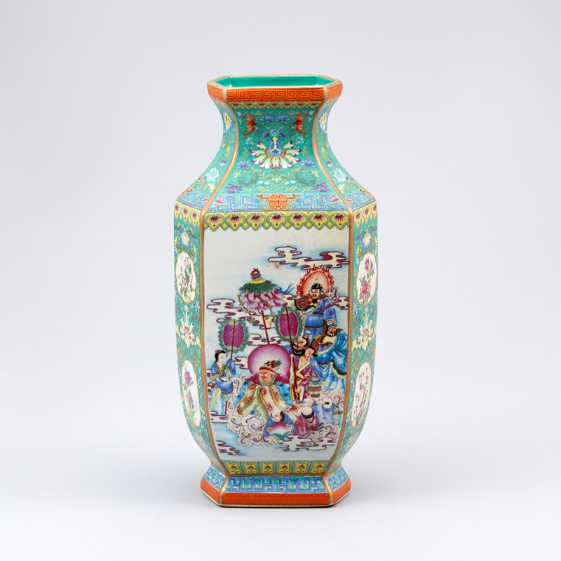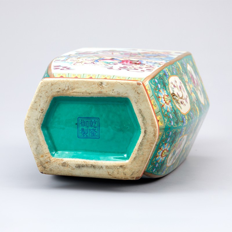 A Hexagonal vase with a design of immortal figures. It has a flared mouth, short neck, tall body, and a hexagonal foot rim. The neck and the body are decorated with peony flowers and plants on emerald green ground. The bottom of the base is inscribed "Qianlong Yuzhi (乾隆御製)" which indicates that it was produced during the reign of the Qianlong Emperor (1736-1795) of the Qing Dynasty.