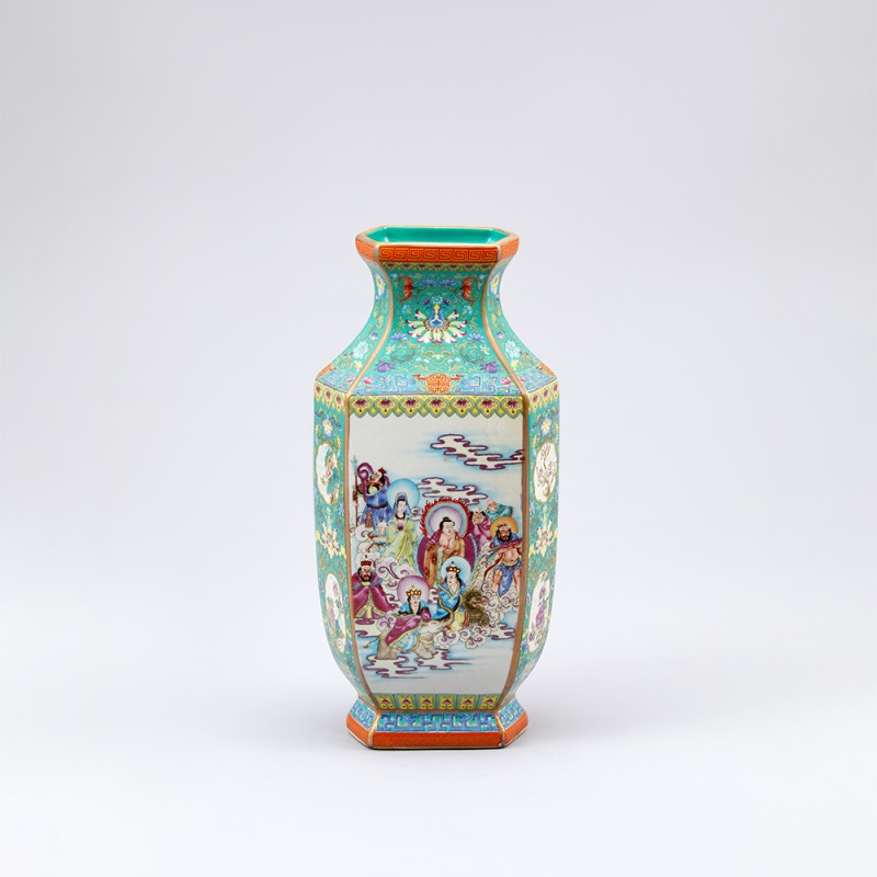 这是腹部前后面绘着群仙图的六方体瓶。撇口,短颈,长腹,六方足。颈部和腹部侧面在松石绿釉地上绘缠枝花卉纹。外底署“乾隆御制”款识,意为乾隆帝时制作。
