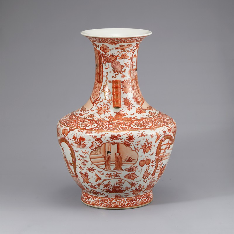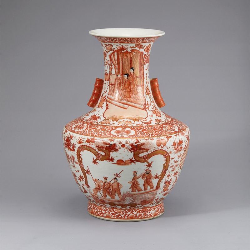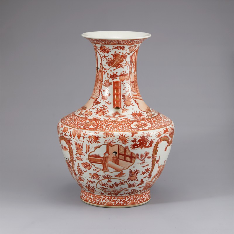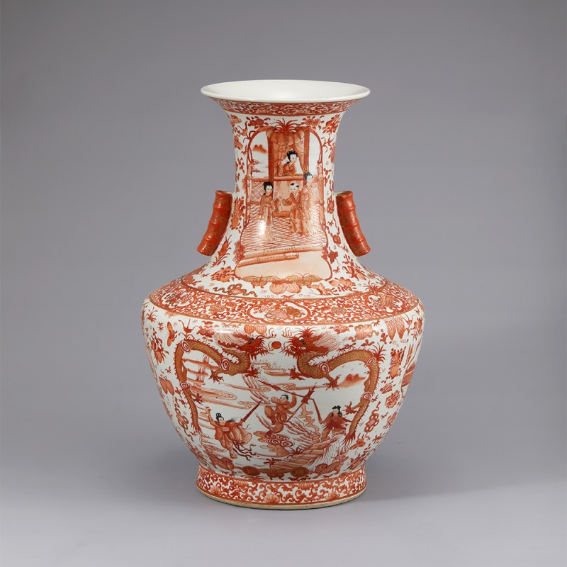 尊撇口,细长颈,颈中部对称置两贯耳,折肩,圆腹,圈足。通体以矾红彩描金装饰,口沿、肩部及圈足外壁处各绘花卉纹,颈部有开光,内绘宫女。腹部两条龙与蝴蝶、瑞兽形成开光,开光内绘人物纹。底足署“惜阴书屋珍藏”款识,“惜阴书屋珍藏”是指位于中国广东省清晖园的惜阴书屋的珍贵藏品,“惜阴书屋”意味着珍惜光阴的书屋。清晖园与佛山梁园、番禺余荫山房、东莞可园一起,并称中国广东的四大名园。
