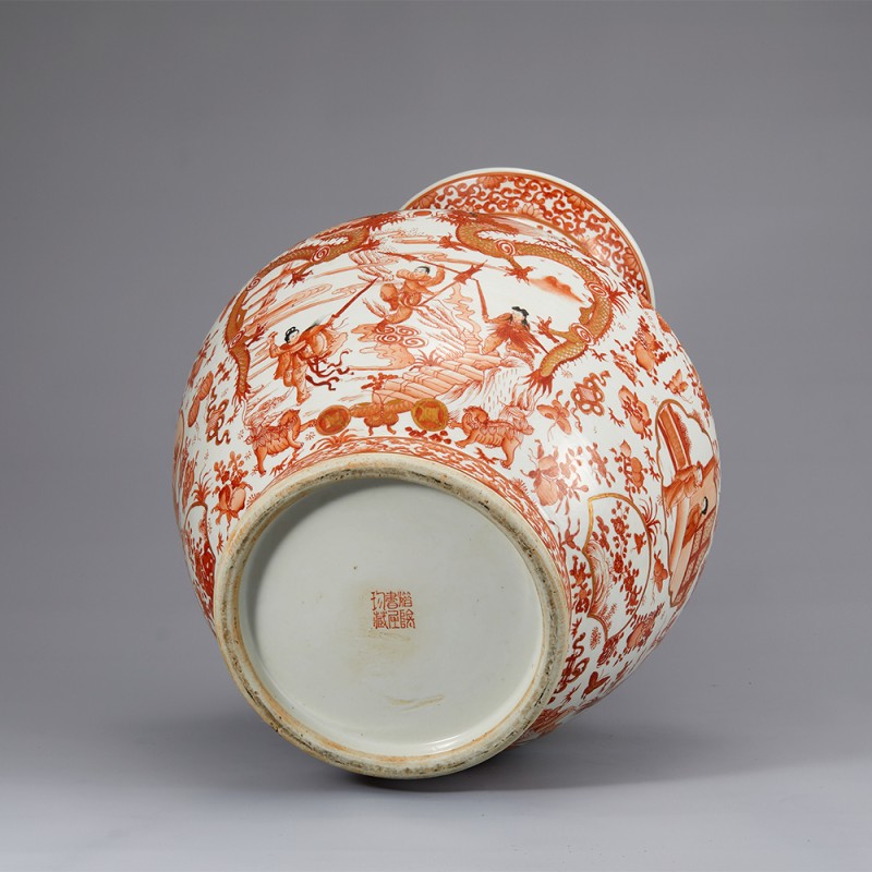 The mouth and the shoulder are colored bright red with gilt gold, the lower foot is decorated with floral scrolls, and the neck is decorated with court lady figures. There are two dragons, an auspicious animal, and butterflies designed as a frame on the front and the back, and inside are figures sailing above the sea. There is an inscription on the base that says, "Xi Yinshuwu Zhencang(惜陰書屋珍藏)." 惜陰書屋珍藏 refers to a precious collected item that belongs to Xi Yinshuwu, located in Qinhui Park (清晖园), Guangdong Province in China. Xi Yinshuwu means "A library that cherishes time." Qinhui park is one of Guangdong's four famous gardens including, Foshan Liangyuan(佛山梁園), Panyu Yuyin Shanfang(番禺余蔭山房), Dongguan Keyuan(東莞可園).
