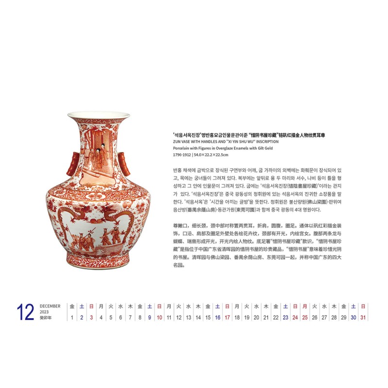 반홍 채색에 금박으로 장식된 구연부와 어깨, 굽 가까이의 외벽에는 화훼문이 장식되어 있고, 목에는 궁녀들이 그려져 있다. 복부에는 앞뒤로 용 두 마리와 서수, 나비 등이 틀을 형성하고 그 안에 인물문이 그려져 있다. 굽에는 ‘석음서옥진장(惜陰書屋珍藏)’이라는 관지가 있다. ‘석음서옥진장'은 중국 광동성의 청휘원에 있는 석음서옥의 진귀한 소장품을 말한다. '석음서옥'은 '시간을 아끼는 글방'을 뜻한다. 청휘원은 불산량원(佛山梁園)·판위여음산방(番禺余蔭山房)·동관가원(東莞可園)과 함께 중국 광동의 4대 명원이다.