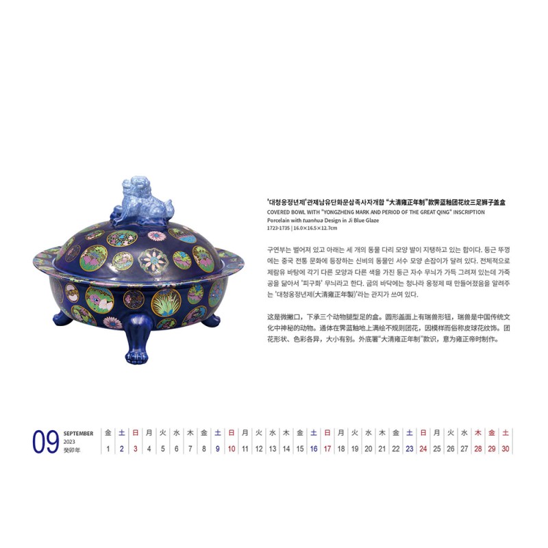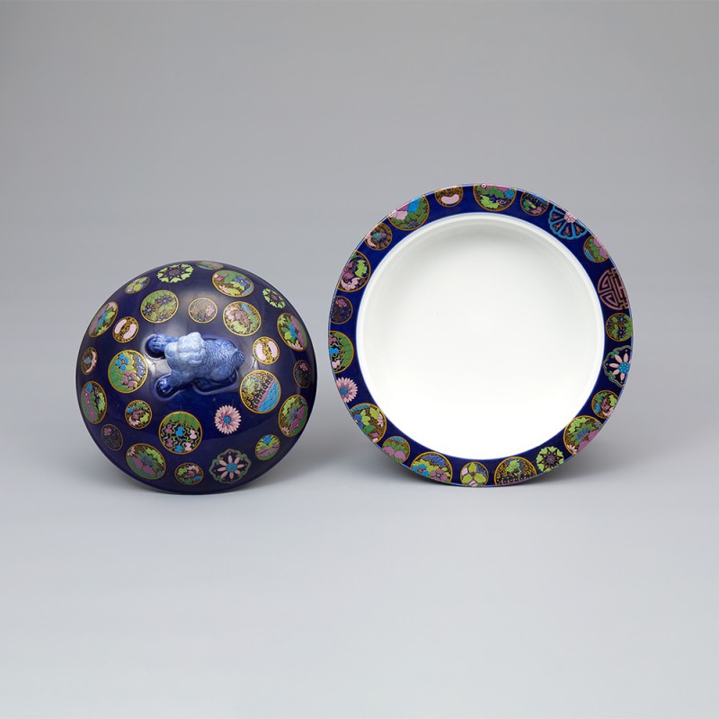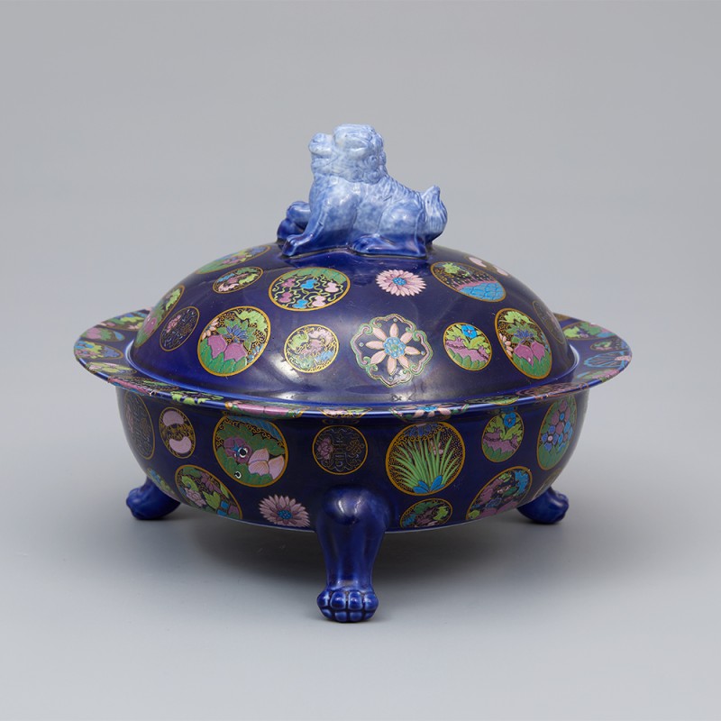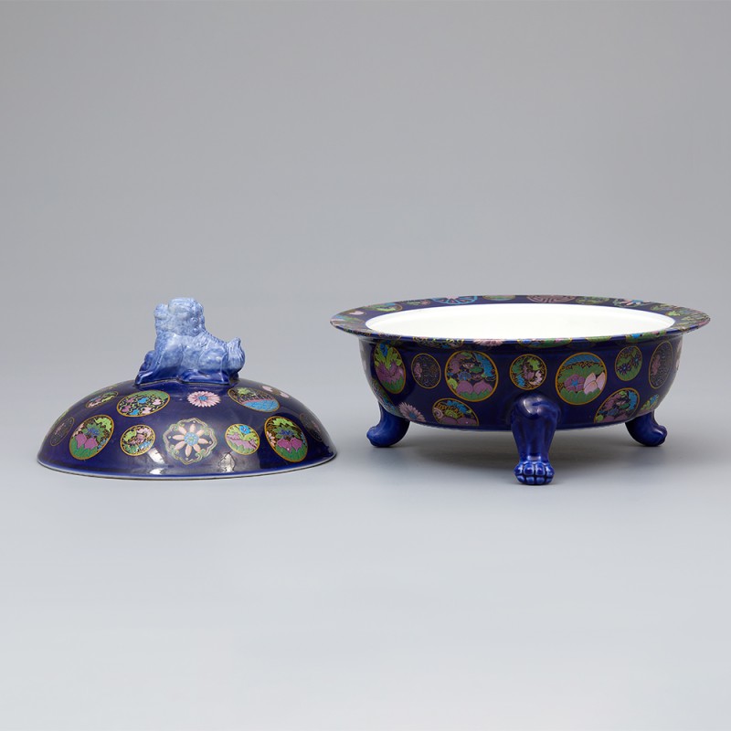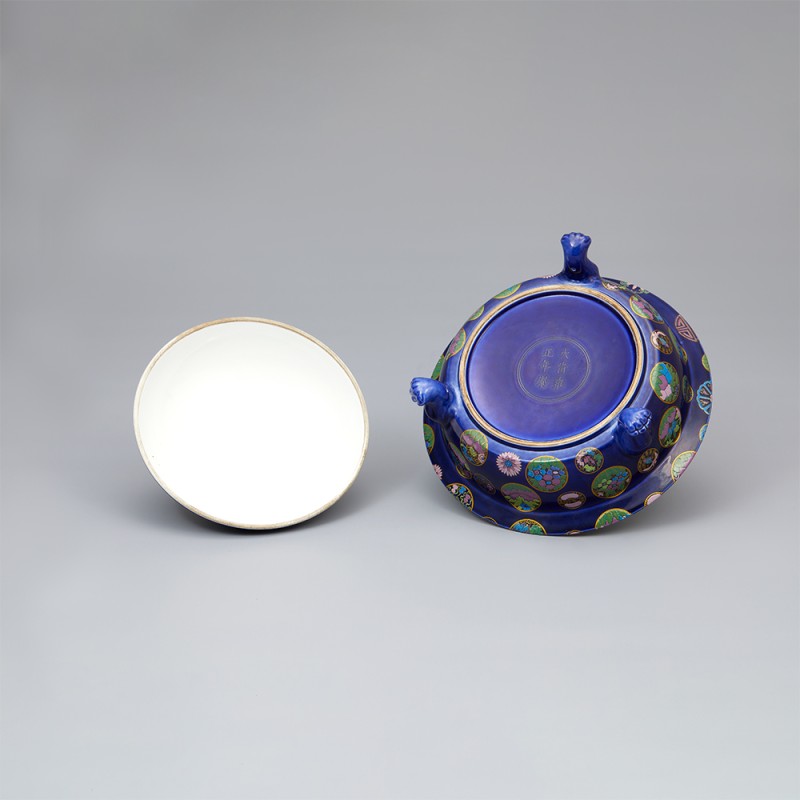 这是微撇口,下承三个动物腿型足的盒。圆形盖面上有瑞兽形钮,瑞兽是中国传统文化中神秘的动物。通体在霁蓝釉地上满绘不规则团花,因模样而俗称皮球花纹饰。团花形状、色彩各异,大小有别。外底署“大清雍正年制”款识,意为雍正帝时制作。