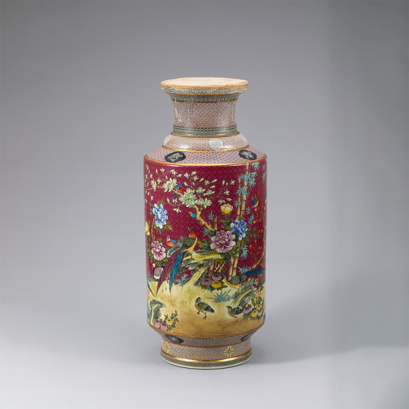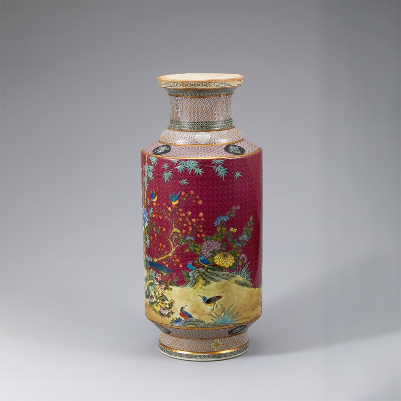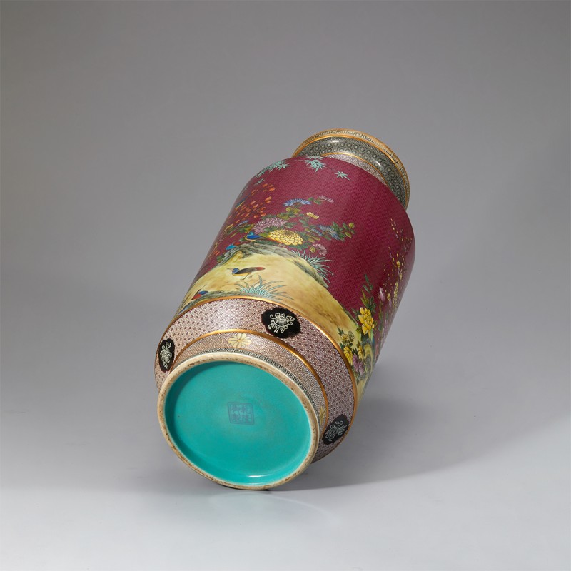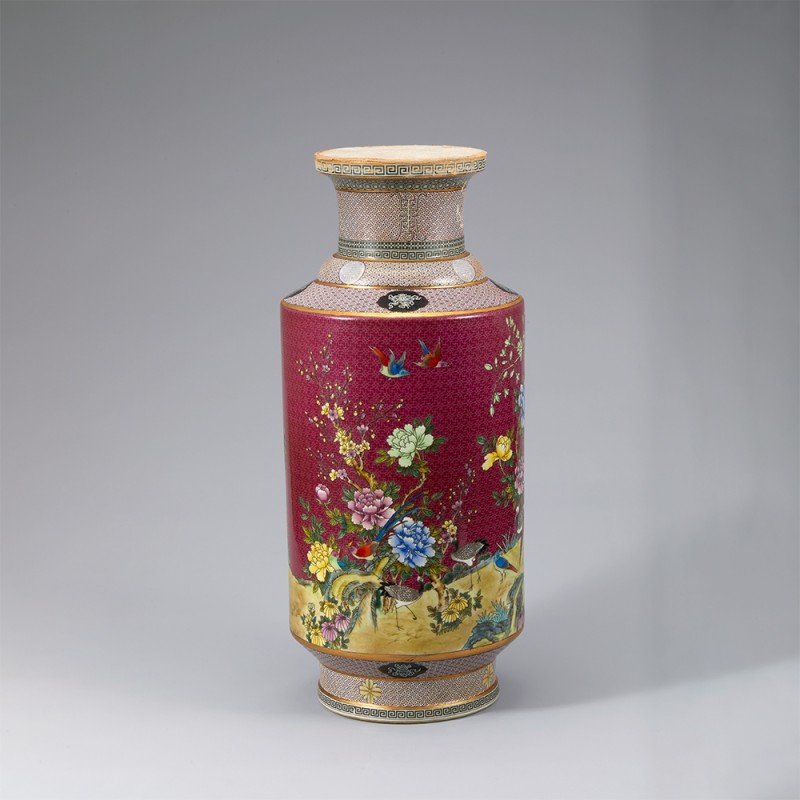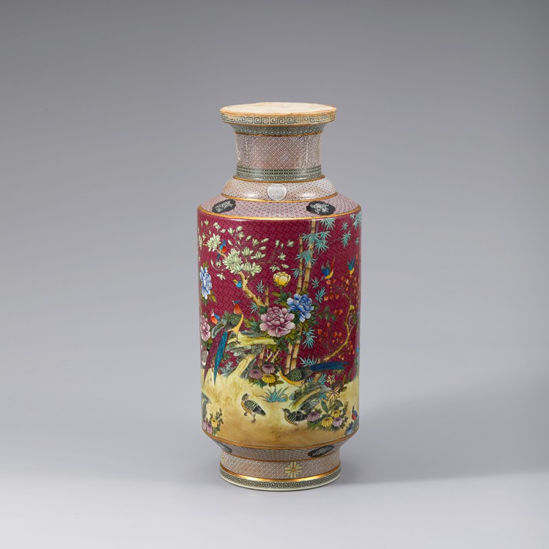A falangcai mallet vase made during the reign of the Qianlong Emperor (1736-1795)of the Qing Dynasty. Bangchui (棒槌) refers to the meaning of hammer. The mouth lip is slightly flared, slightly waisted neck, and drooping shoulders sweeping down to the body. The exterior is a fencai glazed decoration with geometric patterns with birds flying near the blooming flower. Inside of the vase is filled with wine. On the base is an inscription that says, "Qianlong Nian Zhi(建隆年制)", which indicates that is was made during the Qianlong Emperor of the Qing Dynasty.