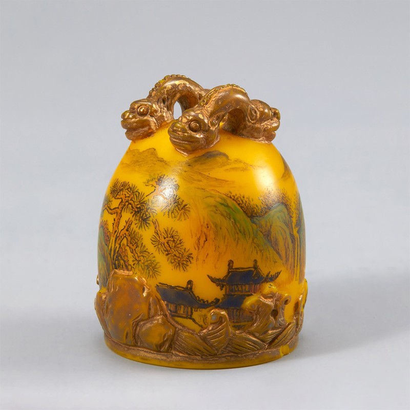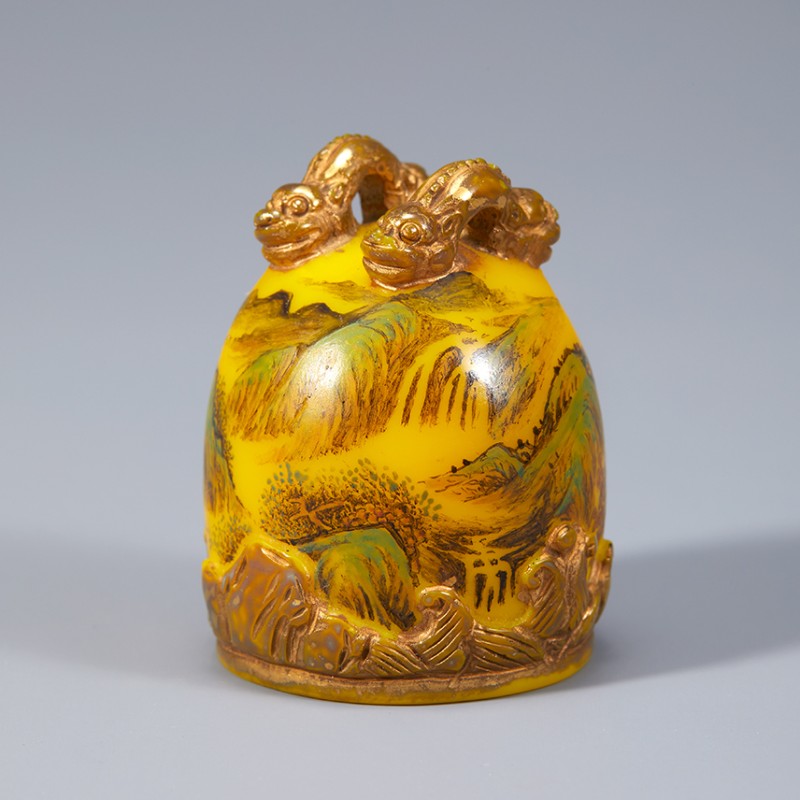중국 복건성의 수산에서 나오는 수산석(壽山石)을 깎아 모형을 만들고 분채로 산수를 그려 완성한 문진이다. 문진은 종이가 말리거나 날라가지 않도록 누르는 무거운 물건이다. 수산석은 재질이 옥(玉)처럼 연해서 불상 같은 조각이나 도장 등을 새기는 중국 최고의 전각 재료로 유명하다. 윗부분에는 두 마리의 용이 엎드려 있는 모습이 구멍이 뚫린 형태로 장식되어 있고, 아래의 몸통에는 부드러운 색채의 분채로 기와집과 소나무, 산과 폭포 등이 아름답게 그려져 있다. 집 앞의 뜰에는 바위가 양각되어 있다. 바닥에는 청나라 건륭제(1736~1795) 때 만들었다는 의미의 '乾隆年製(건륭년제)'라는 관지가 검정색으로 쓰여 있다.