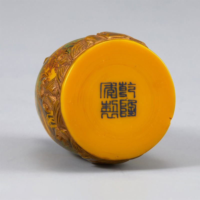A paperweight that is made with a rock called "Shoushanshi(壽山石)", which can be found in Shou mountain, Fujian Province. It was first carved and then decorated with a landscape design in fencai glaze. A paperweight is a heavy object that presses the paper to prevent it from flying away or being rolled up. Due to the light jade-like texture of Shoushanshi, it is the best-known medium for sculpting or carving stamps or Buddha figurines in China. The upper part of the paperweight is decorated with two dragons laying down, which is almost in a shape of a hollow round handle. Below, it is decorated with beautiful scenery of a house, pine tree, mountain, and waterfall in soft colors of fencai glaze. In front of the house is a carved design of the stone. On the base is marked in black, "Qianlong Nian Zhi (乾隆年製)", which indicates that it was produced during the Qianlong Emperor(1736~1795) of the Qing Dynasty.