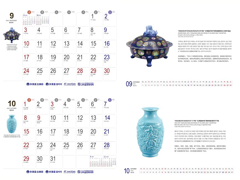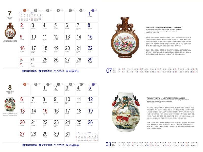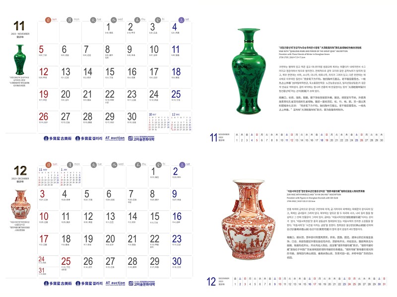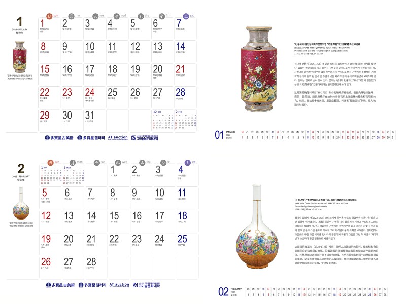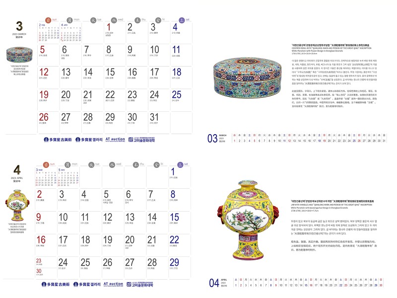 목록 청대 도자기 달력 페이지 정보 조회수2,727 작성일23-01-31 16:35 본문 다보성 갤러리가 소장하고 있는 중국 청대 유물들 중 김종춘 회장님께서 직접 선정한 13점의 유물로 디자인 한 달력입니다. 이전글청화유리홍봉수주자 23.01.31 다음글'건륭년제'관분채산수문문진 23.01.31 목록