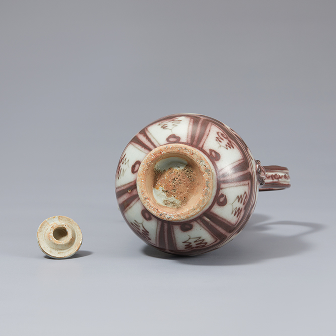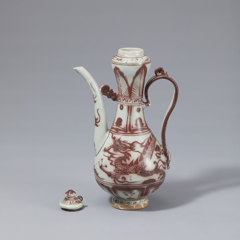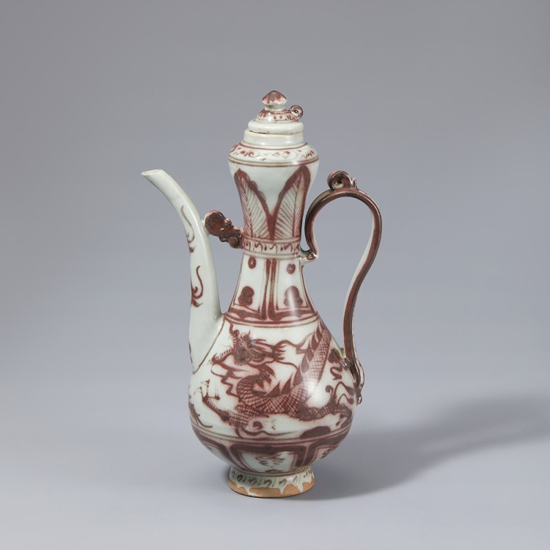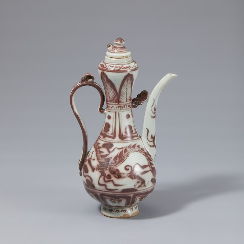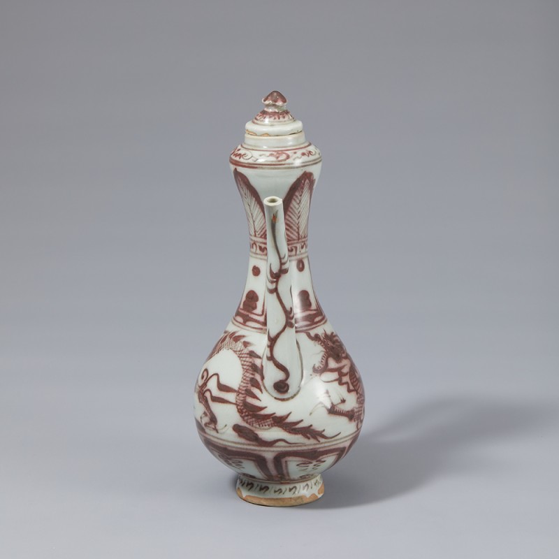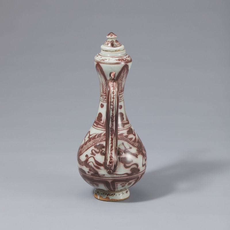 A garlic-headed ewer with small rings on a lid and handle. An ewer with a cylindrical neck and bulging shoulder tapering to the bottom. A handle is angled and the tip of the handle is slightly bent. A dragon flying in the sky through clouds and fog with its head up is painted on the body.
