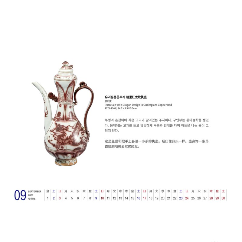 뚜껑과 손잡이에 작은 고리가 달려있는 주자이다. 구연부는 통마늘처럼 생겼다. 몸체에는 고개를 들고 당당하게 구름과 안개를 타며 하늘을 나는 용이 그려져 있다.