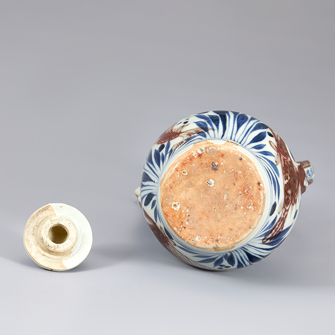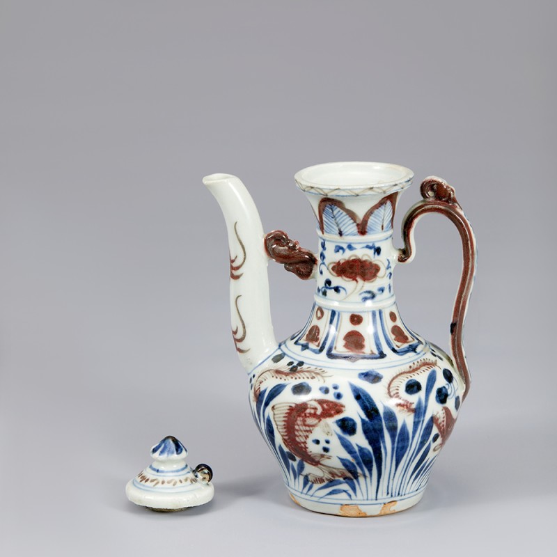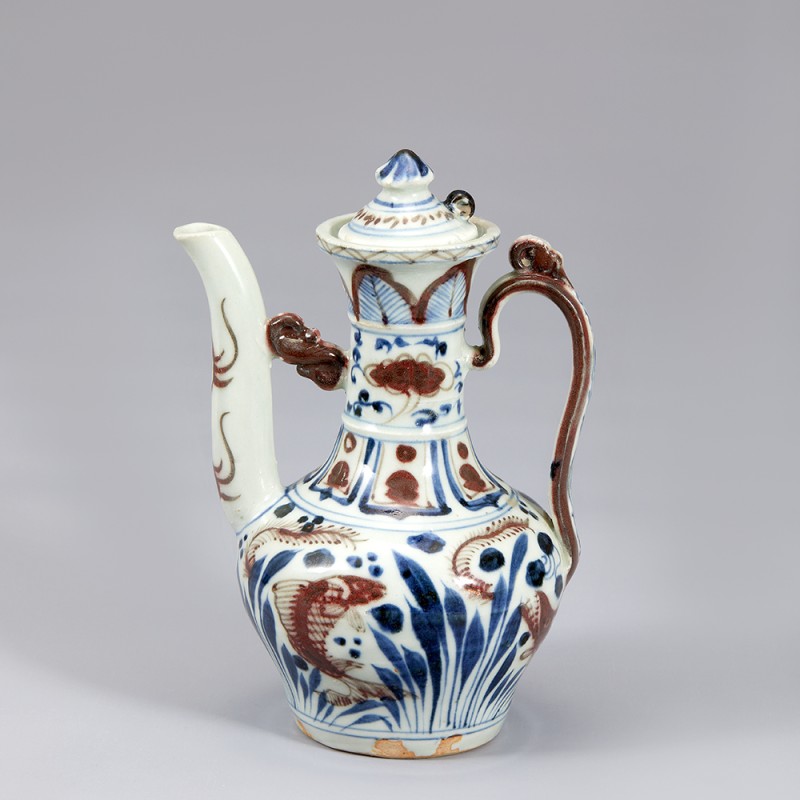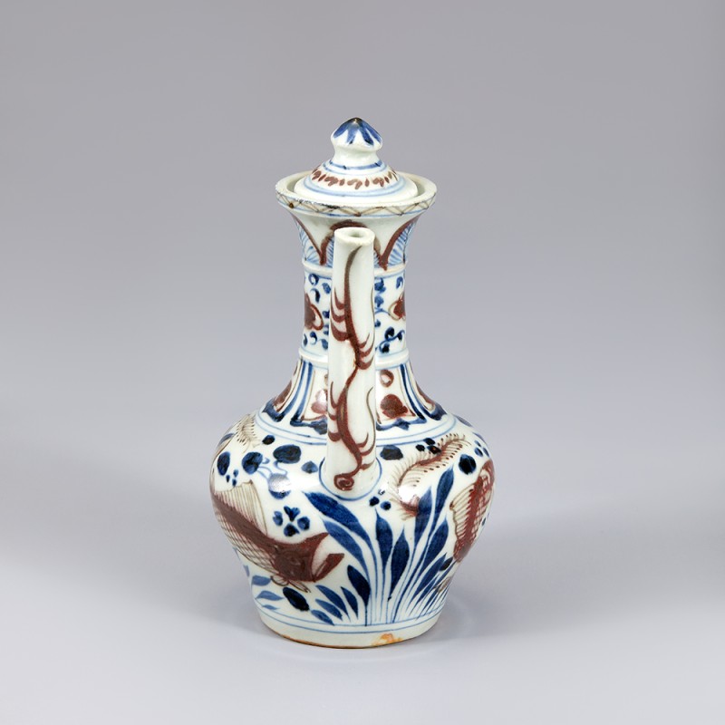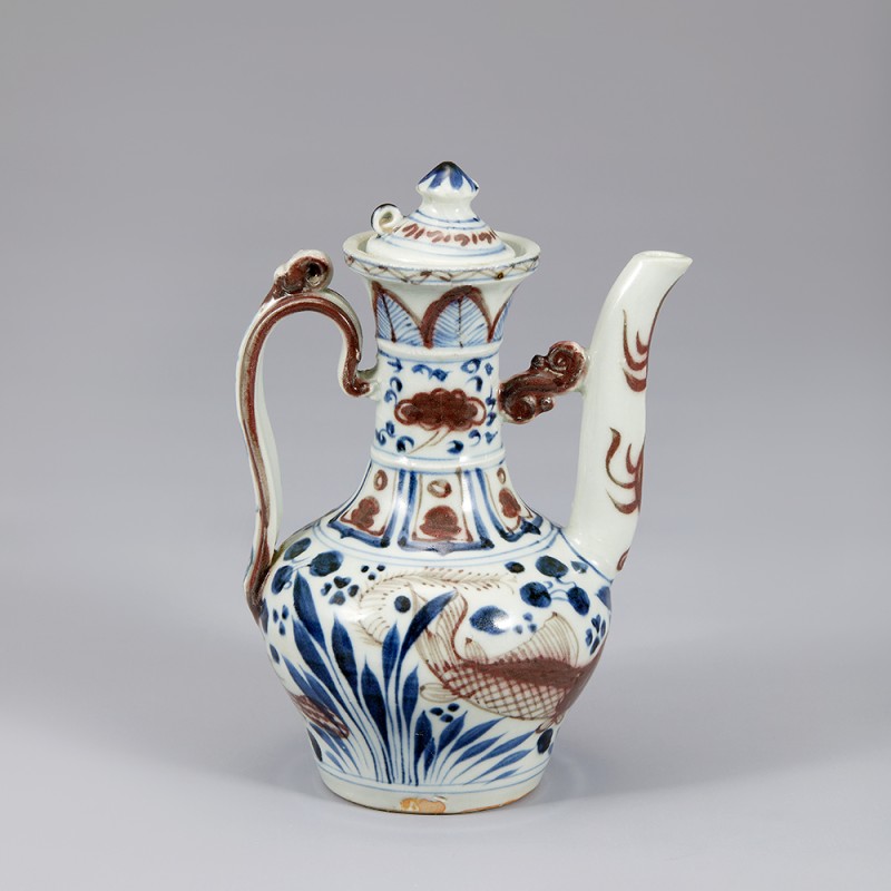 Slightly flared mouth, thin neck, round foot, and spout on the stomach. The spout is braced by S-shaped strap that connects to the neck. A handle is attached to the neck and stomach. The decorations on the neck are divided into several layers; a plantain design on the upper side, clouds in the middle, and a lotus design on the base. On the stomach are a mandarin fish and a carp swimming through lotus, and water plants.