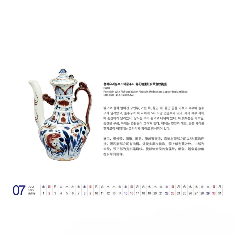 밖으로 살짝 벌어진 구연부, 가는 목, 둥근 배, 둥근 굽을 가졌고 복부에 출수구가 달려있고, 출수구와 목 사이에 S자 모양 연결부가 있다. 목과 복부 사이에 손잡이가 달려있다. 장식은 여러 층으로 나뉘어 있다. 목 윗부분은 파초잎, 중간은 구름, 아래는 연판문이 그려져 있다. 배에는 연잎과 해조, 물풀 사이를 한가로이 헤엄치는 쏘가리와 잉어로 장식되어 있다.