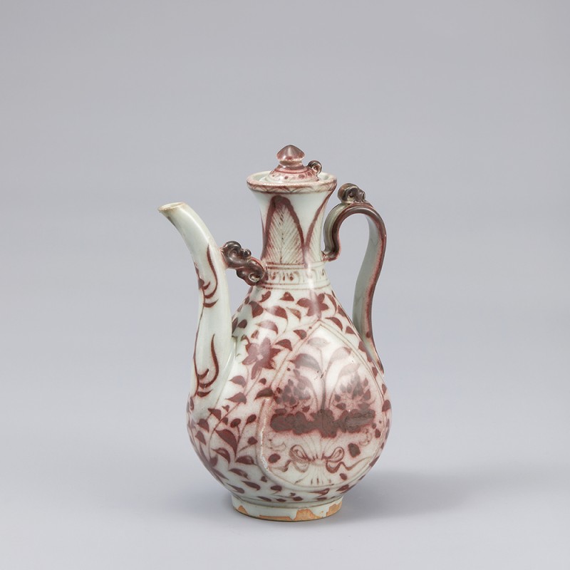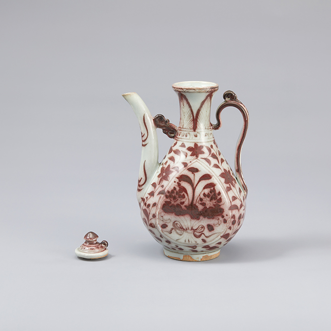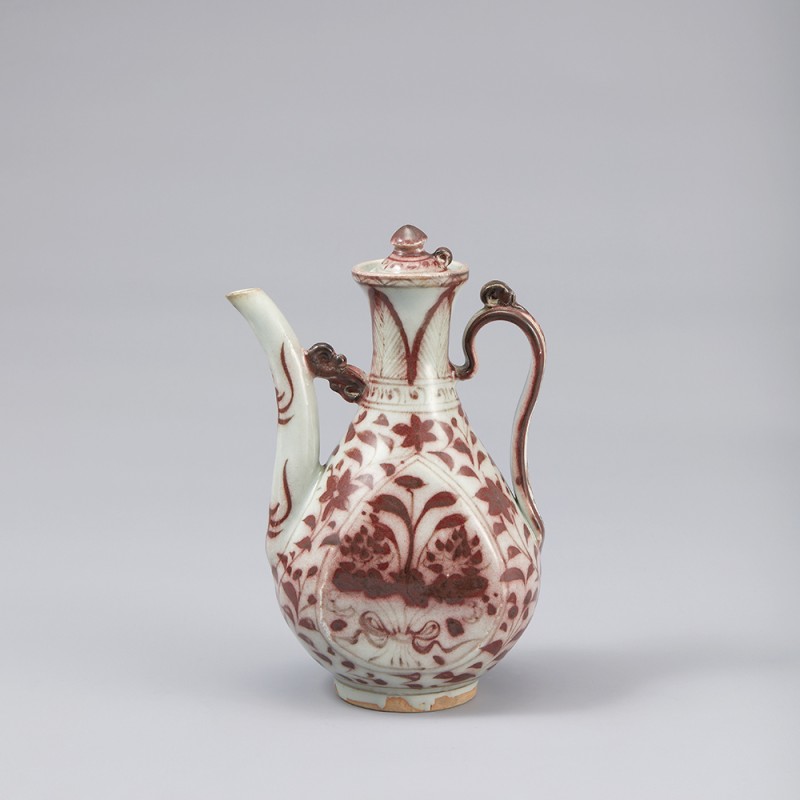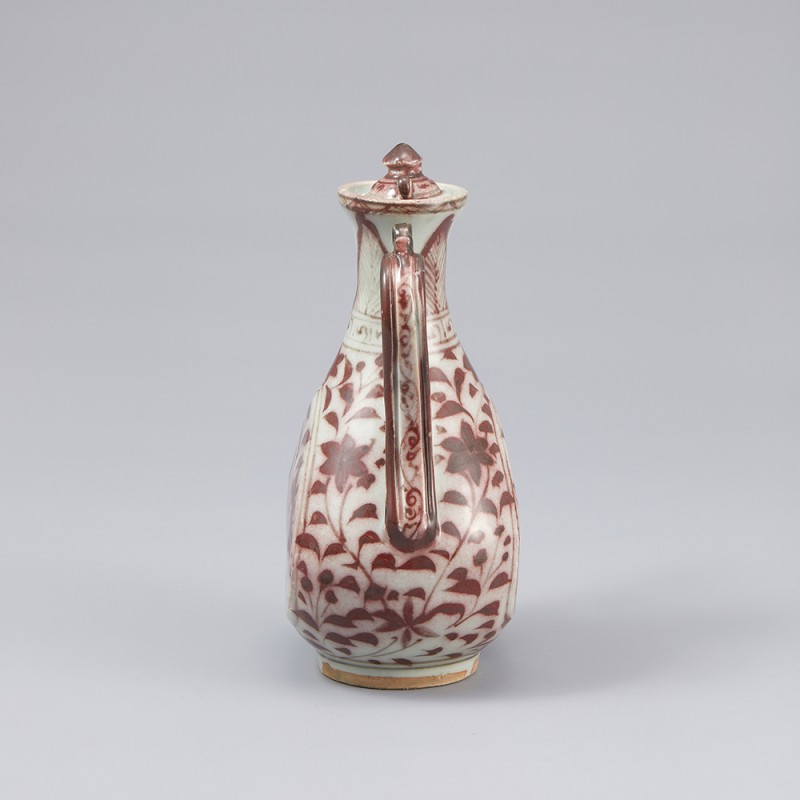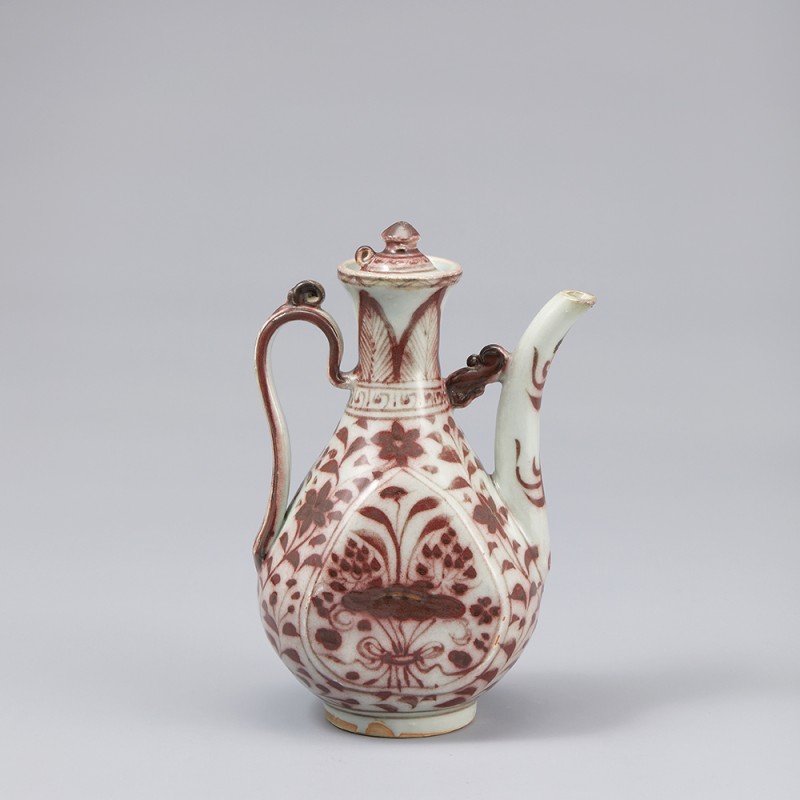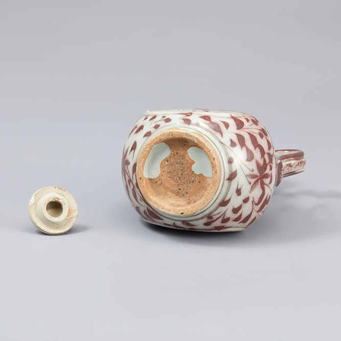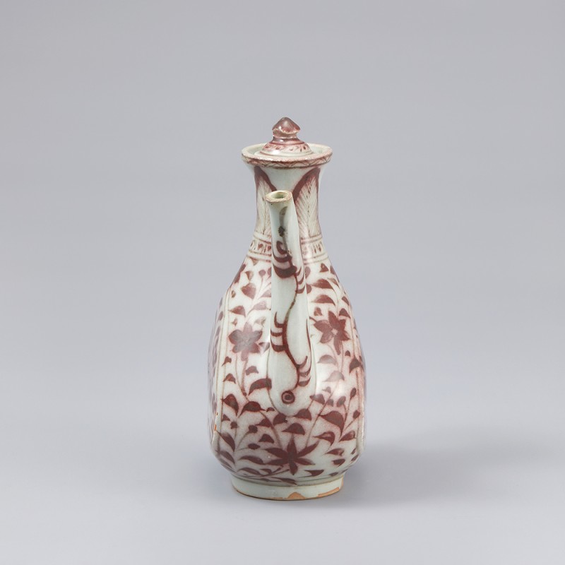Slightly flared mouth, thin neck, round foot, and spout on the stomach. The spout is braced by S-shaped strap that connects to the neck. A handle is attached to the neck and stomach. On the flat side of the round body is a lotus flower design.