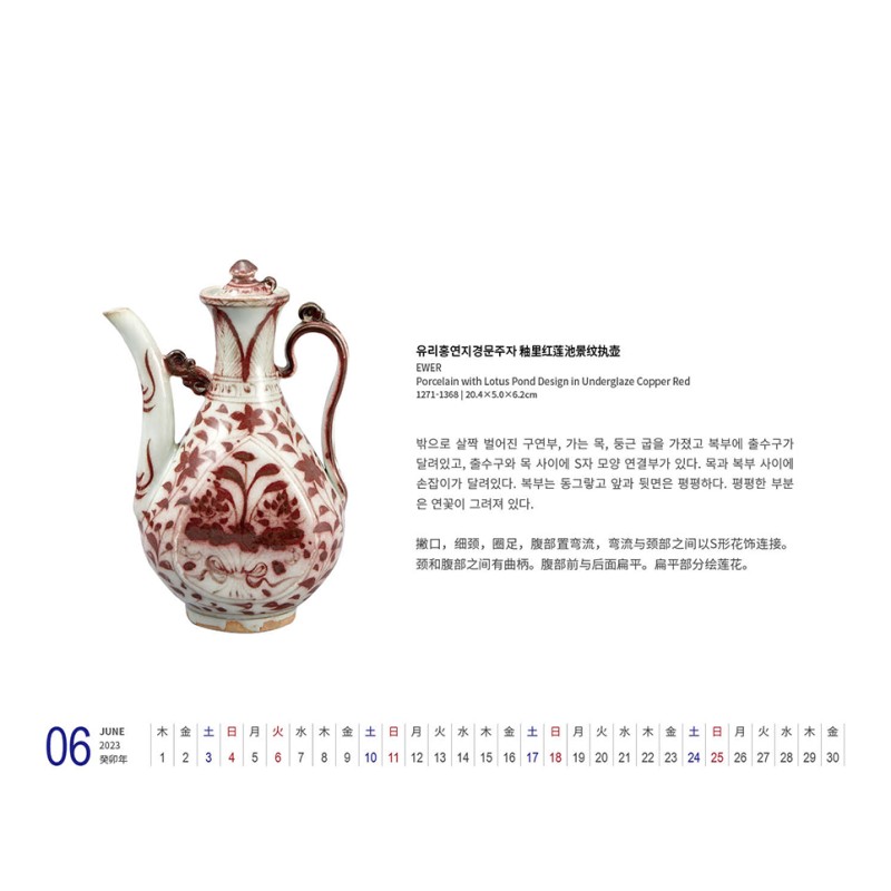 밖으로 살짝 벌어진 구연부, 가는 목, 둥근 굽을 가졌고 복부에 출수구가 달려있고, 출수구와 목 사이에 S자 모양 연결부가 있다. 목과 복부 사이에 손잡이가 달려있다. 복부는 동그랗고 앞과 뒷면은 평평하다. 평평한 부분은 연꽃이 그려져 있다.