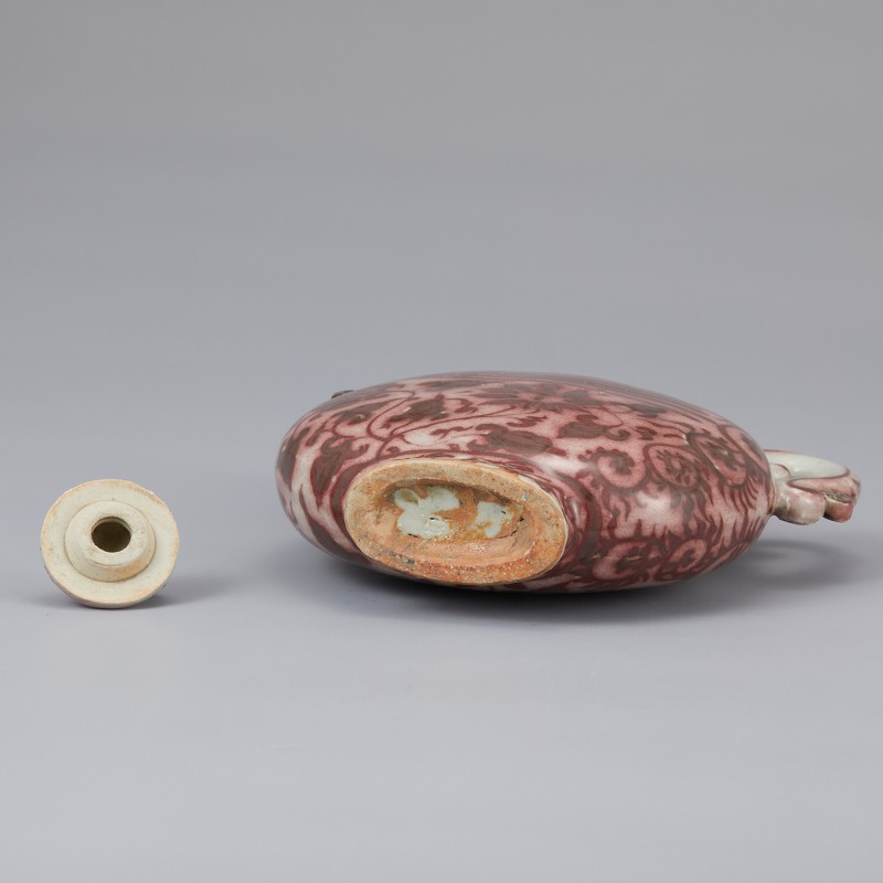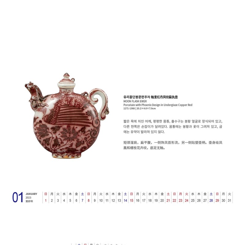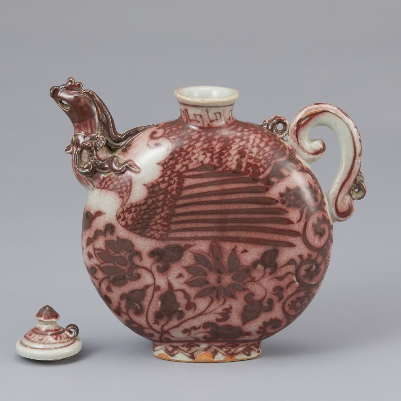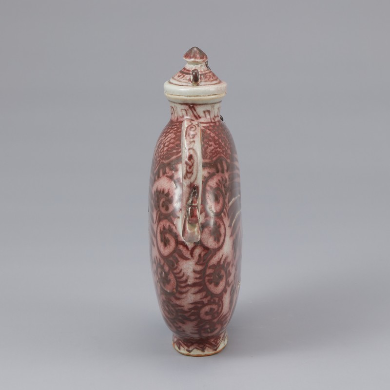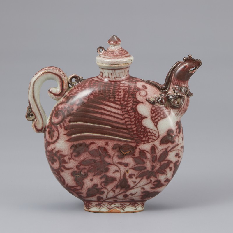 짧은 목에 처진 어깨, 평평한 몸통, 출수구는 봉황 얼굴로 장식되어 있고, 다른 한쪽은 손잡이가 달려있다. 몸통에는 봉황과 꽃이 그려져 있고, 굽에는 유약이 발라져 있지 않다.