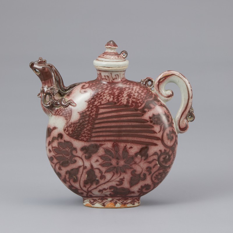 Short neck, drooping shoulders, flat body, phoenix-headed spout, and a handle attached on the side. The body is decorated with a phoenix and flowers.
