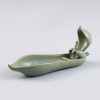 This incense holder is shaped like a lotus petal resembling a small boat with a sail. At the end of the leaf sits a lotus seed pod, and on top of it is a small figurine, giving the impression of a boat floating on water. In the center of the seed pod, there is a hole designed to hold incense. In Buddhism, the lotus symbolizes purity and enlightenment, and because it simultaneously bears both flowers and seeds, it also represents vitality and abundance. The combination of the lotus, the act of burning incense, and the small monk-like figurine reflects a Buddhist worldview.