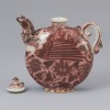 釉里红是釉下有红色图案而得名,是氧化铜在高温还原焰呈红色,也被称为铜画的一种陶瓷装饰法。釉里红在元代随着青花瓷的制作,在14世纪非常流行,包括景德镇一带在内的江南地区的战乱导致青花颜料进口中断后,取代了青花瓷。该釉里红执壶被认为是反映元代陶瓷史变迁的珍贵文物。