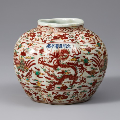 명나라 만력 연간(1573~1620)에 제작된 용봉문(龍鳳紋) 오채(五彩) 항아리입니다. 짧고 두꺼운 구연부와 둥글게 팽창한 몸체, 안정된 저부를 지녔습니다. 표면에는 수직 방향으로 반복된 골이 형성되어 기면에 입체감이 느껴집니다. 전면에는 백유를 두껍게 시유한 뒤 적색, 녹색, 황색 세 가지 안료를 사용한 오채 기법으로 문양을 그렸습니다.