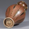 A lotus-shaped applique motif is on the shoulder. On the exterior, speckles and vertical brown splashes that appear to flow downward are decorated. Such motifs are frequently seen in Longquan ware, but are rare in soy-glazed artifacts.