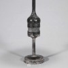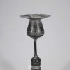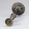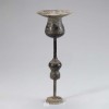 Thin horizontal grooves encircle an everted mouth and a swelling belly. Beneath them is a long stick with a bulging rounded middle part. The surface of the grip is pierced in circle, and a thin, hollow foot supports the whole structure.