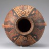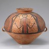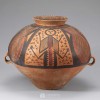 A painted pottery neolithic two-handled 'figural' jar produced in the neolithic era. A pair of loop handles are on both sides of the body, and black, dark red figures and geometric patterns like cross-hatches are on the upper body.