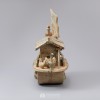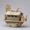 This green-glazed boat was made during the Han Dynasty (202 BCE–220 CE). The boat features a large, tile-roofed building, symbolizing an imperial palace, standing majestically on its deck. A dragon, representing the ruling family that first unified China and safeguarded the nation, is seen coiling towards the sky atop the roof. Three window openings in the walls allow a view of the external world, depicting a symbolic perspective of the male-dominated society at the time. Green-glazed vessels featuring figures peering out of windows are rare.