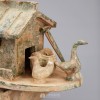 Green glaze was created by applying a lead-based glaze that turned green or blue when fired at low temperatures. As high-fired celadon glaze was later developed, green-glazed pottery gradually disappeared. However, Han green-glazed ceramics influenced the Korean Peninsula, particularly in the Silla Kingdom, as seen in artifacts such as the Green-Glazed Pavilion Banquet Figurine, which is now housed in the National Museum of Korea.
