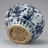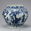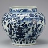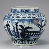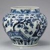 The blue-and-white porcelain jar is painted with a scene from the novel "Romance of the Western Chamber (西廂記)," depicting 20-year-old Zhangsheng and a 19-year-old Yingying falling in love and talking secretly to each other, in a dark cobalt-blue pigment.
