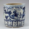 The exterior is painted in underglaze cobalt blue with Guiguzi, a thinker of the Chu of warring states, sitting in a cart pulled by a tiger and a leopard down the hill to release the people captured as slaves. The opposite is a cavalryman hurrying with a long spear on his shoulder. The top and the side of the mouth are bordered with floral scrolls within lines, and the lower body is encircled by upright lotus lappets with various patterns.