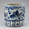 筒外侧用钴蓝色描绘了中国战国时代的楚国思想家鬼谷子(BC 11世纪-BC 223年)为了释放被俘的百姓,从鬼谷的山上骑着老虎和豹子拉着车下来的场面。另一边是骑着马疾驰的将领和肩上扛着长矛匆匆前行的士兵。 口沿部上端和侧面反复绘唐草纹,底部饰连续的荷叶的变形即莲瓣纹。
