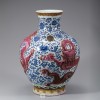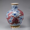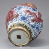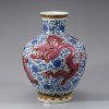 청나라 건륭제(1711~1799) 때 제작된 것으로 동체 전면에는 청화로 보상화(寶相華)와 넝쿨문양을 생동감 있게 배치하였으며, 용무늬를 양각하고 붉게 채색한 청화연지홍채 용무늬 항아리입니다.