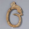 此件玉龙体型硕大,通体光素,鼻部及唇部前突,龙眼凸起呈菱形,前面圆,眼尾细长上翘。颈上有长鬓,尾部尖收而内上卷,体弯似钩,颇似英文字母C。嘴部与尾部相连,造型奇特。身体上刻人形图案,刻纹虽简单却栩栩如生,自然老化痕迹明显。龙身体中间有打一个对孔,可见其自然打磨痕迹,表面有自然沁色。