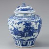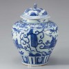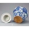 这是有盖,口沿部和足较大,肩部宽阔的器型上用钴蓝颜料绘制了古代传说故事种的人物们的青花白瓷罐。