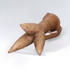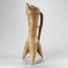 A white pottery tripod ewer for heating drinks. It has a small round spout on an elongated body terminating in three tapering bulbous feet. A large strap handle is attached to the legs and neck. The neck is embellished with a notched collar below the domed mouth. Tripod earthenwares are usually found in neolithic sites of the Han dynasty. The present relic resembles the one housed in Harvard Art Museum and is larger than that.