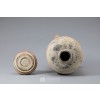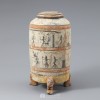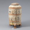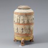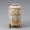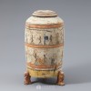 圆柱形器身由褐色彩绘形似老虎形状的3条腿支撑,上有褐色圆纹的盖子。