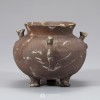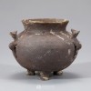 Yingtao (硬陶, hard pottery) was first produced in the Neolithic era and was widespread among royalty and nobles from the late Shang Dynasty to the mid-Western Zhou Dynasty. The censer has three beast handles on the shoulder, and the body was beaten to toughen the surface, causing an imprinted checkerboard pattern. Under a swelling stomach are short tripod legs. The number three was believed to be the perfect number, symbolizing the way of the universe's core consisting of heaven, earth, and human.