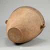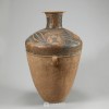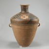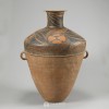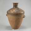 The mouth is slightly flared, the waisted neck broadens around the shoulders, and the vast body tapers towards the bottom. The foot is small, and a pair of ringed handles are attached symmetrically on both sides of the body. The exteriors of the handles are serrated, and the body is encircled by a grooved band in the middle. On the broad shoulder and neck is a repeating pattern of circles, spirals, and curved lines in black.
