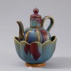 钧窑特有的带有光泽的蓝色底色上有红色斑纹,出水口、把手、线条突出部位等呈现黄绿色色感。