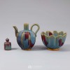 It has red splashes on the 'jun' whitish blue ground. Protruding parts like spout or handle glaze in yellowish green.