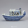 A boat-shaped blue and white porcelain water dropper, presumed to be one of the grave goods excavated in the imperial tombs of the Yuan Dynasty. It is wide in the middle and narrows to the front and the back. In the rectangular section cabin is a captain seated forward with his hands together. Behind him are windows with seats outwards on both sides of the cabin. A boatman in a hat leans on the back of the cabin with both hands on the roof.