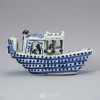 据推测,这是元代皇帝或贵族古墓中的陪葬品"明器",该青花白瓷船形砚滴,整体呈船舶形状,前后窄,中间船体部分相对较宽阔。在长方形船舱的中间,船长双手合十坐着望向远方,后面的左右窗户各放置一个座位。船尾上戴着帽子的船夫双手靠在船舱的屋顶上。