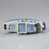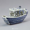The boat and the cabin are decorated with floral scrolls and geometric patterns with dots and lines in vivid cobalt underglaze blue, symbolizing eternal life and prosperity. There are two holes on the front and the back of the boat, and water in the dropper can be released through a B-shaped pierce on the front.