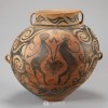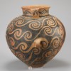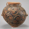 A pair of loop handles are on both sides of the neck, and a pair of ringed handles are on both sides of the stomach. The whole figure is asymmetric, and the stomach tapers rapidly to the foot. On the exterior of the body are two figures dancing in the sun, surrounded by black spirals. These smooth abstract lines show the artistic ability of the time.
