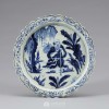 This lobed disk is painted with Tieguai with a headband and a huge gourd bottle on the shoulder, walking alongside a drooping willow and large plantain leaves, all in a cobalt-blue glaze in the center of a slightly recessed interior.