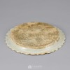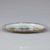 这是口沿部呈花瓣状,内侧呈稍微凹陷的花形盘。盘中间用钴蓝色绘头戴发带背着大葫芦瓶的铁拐,在垂柳和大芭蕉叶之间行走的样子。